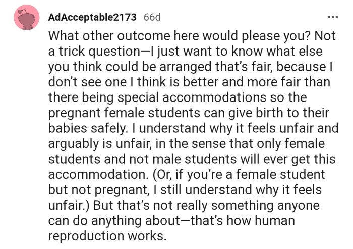 "I understand why it feels unfair and arguably is unfair, in the sense that only female students and not male students will ever get this accommodation."