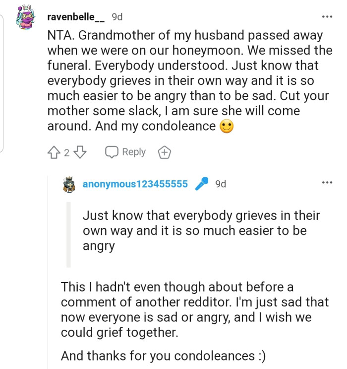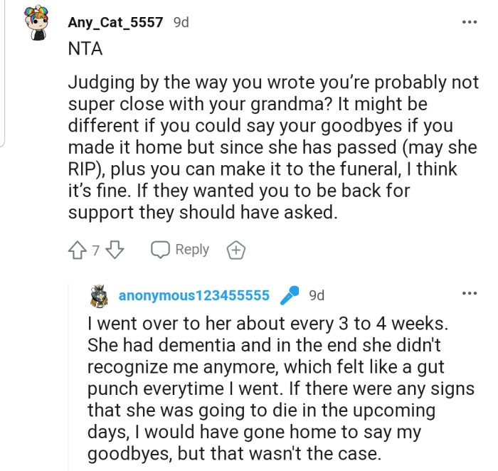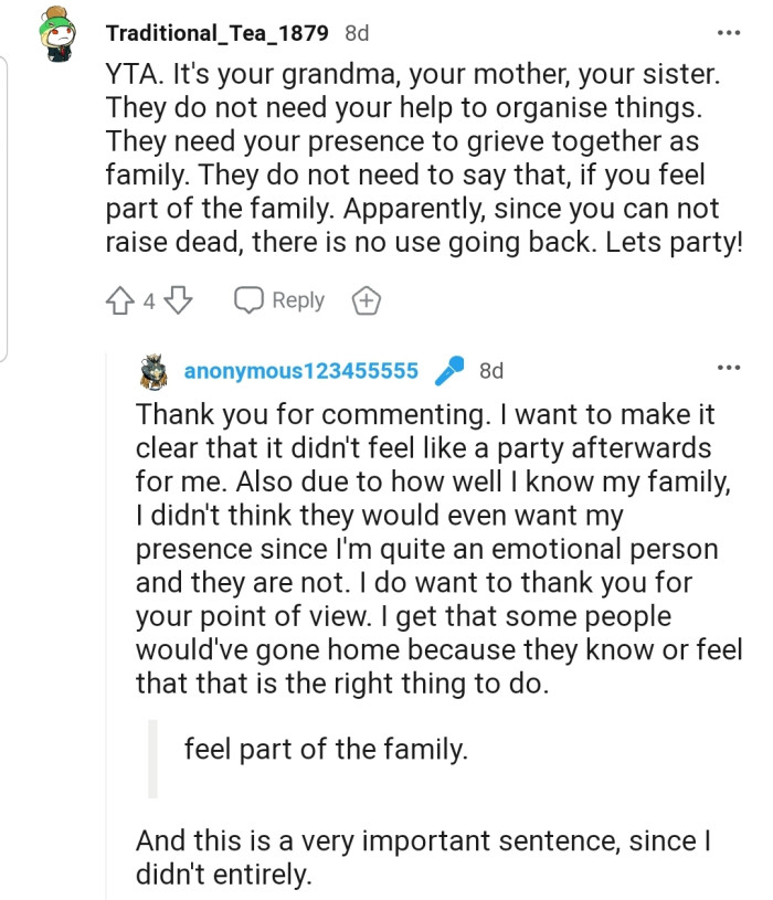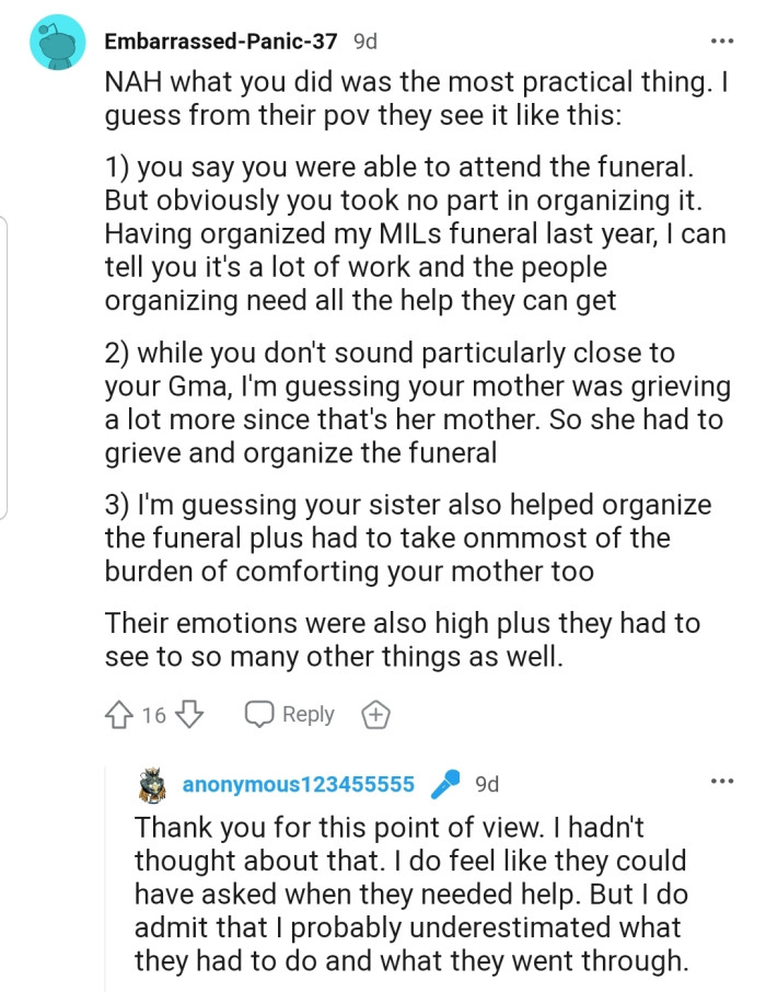 Indeed, this came as a shock to OP, who argued that the family had made it clear that they didn't need her for anything. Although she admitted that grieving with the family would have been ideal, she expected her mom to have at least made the request directly during the call.