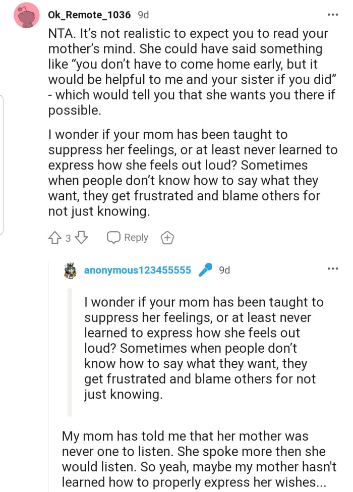 "NTA. It’s not realistic to expect you to read your mother’s mind."