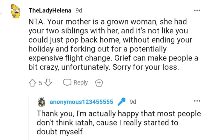 Research in grief psychology emphasizes the importance of self-care during mourning periods. A report from the American Psychological Association highlights that maintaining routines and engaging in self-care activities can be beneficial for emotional health, even in the face of loss. The Redditor’s decision to continue her vacation could reflect a strategy to preserve her mental well-being.