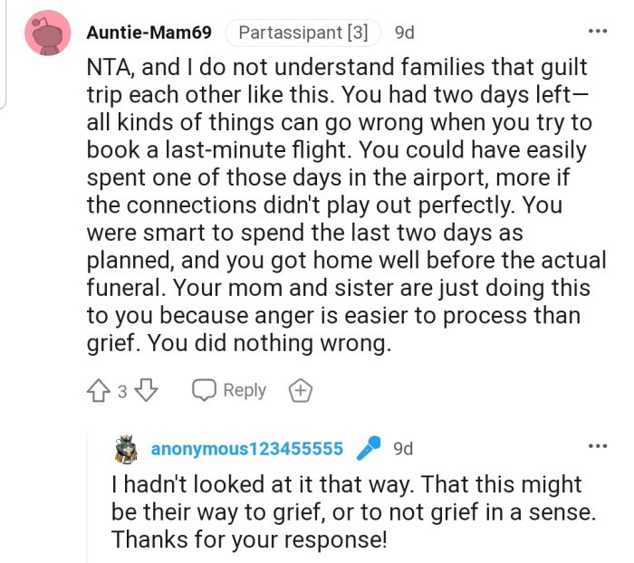 It’s essential to recognize the impact of emotional resilience in coping with loss. Psychological research indicates that individuals with higher emotional resilience tend to adapt better to change and loss. The Redditor's decision to maintain her vacation may reflect her emotional resilience and ability to navigate grief in a way that feels right for her.