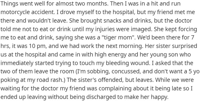 Reddit"When OP was in a hit-and-run motorcycle accident, she drove herself to the hospital, but her friend insisted on staying with her. As they waited for the doctor, her friend started complaining about the late hour, so OP made the unfortunate decision to leave the hospital without being officially discharged, just to please her."