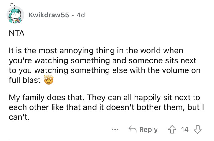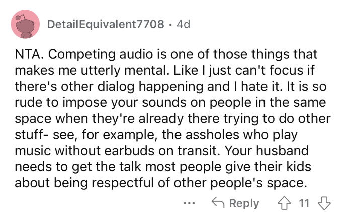 Reddit/languagegatorRecently, the OP snapped at her husband for offering her the TV only to put two shows on in the same room, one on his computer and one on his phone.