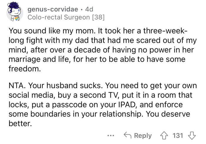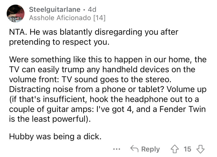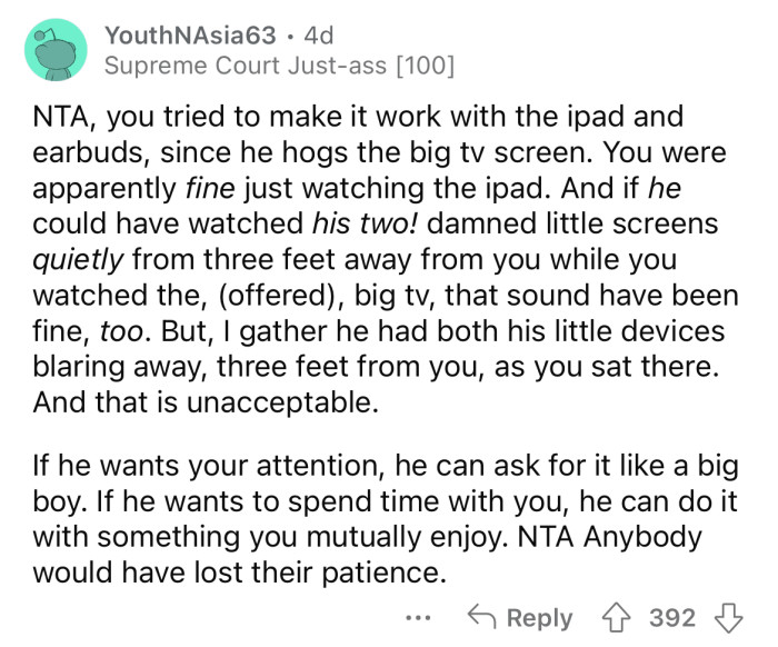 The last straw was when she got home from work and went to watch a movie on her iPad, and her husband insisted that she could use the TV. So, the OP went ahead and started watching her movie on the TV, only for her husband to put two different things on in the same room with the volume turned up—one show on his computer and the other on his phone.