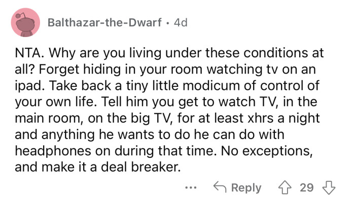 But what happens when your significant other likes to control the TV, making it almost impossible to watch what you want? Well, Reddit user u/languagegator posted about this exact problem in the AITA (Am I The A**hole?) subreddit recently.