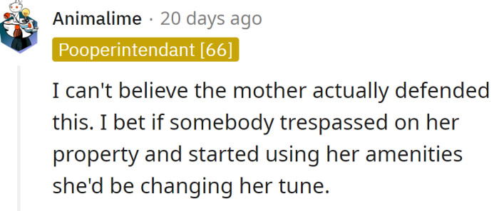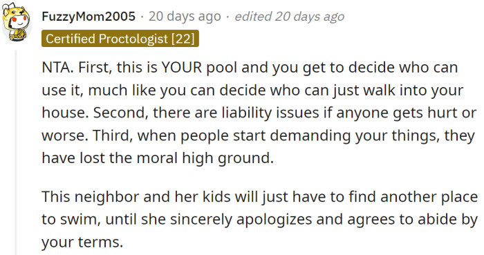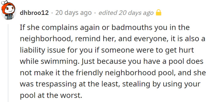 When questioned, the neighbor said she had taken a day off work to spend quality time with her children and "borrowed" their pool, assuming the couple's childless status rendered it underutilized. The OP asked her to leave, causing tension as the neighbor insisted on an explanation.