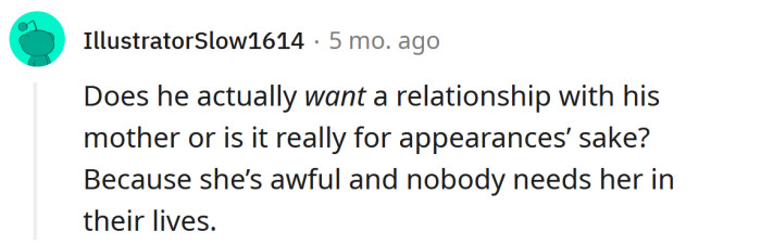 The Redditor explained that she and her husband had not had contact with his mother for months before he went to wish her a happy Mother's Day. He immediately regretted his decision because his mother tried to make the whole day about her and was prying for information on their daughter's first birthday.