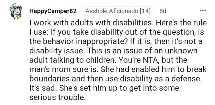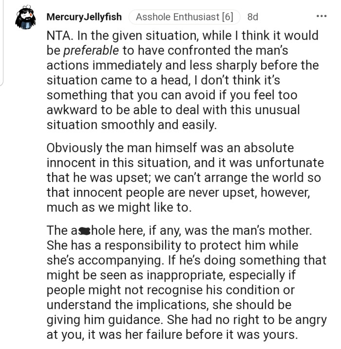 Not long after, the man's mother stormed up to OP and accused her of not being understanding of her son's condition