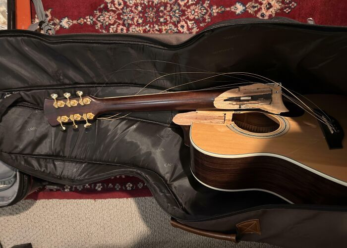 "Forced To Gate Check Guitar, Got It Back Split In Half"