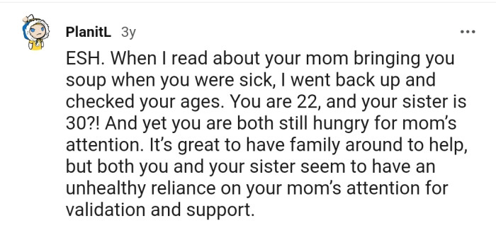 "It’s great to have family around to help, but both you and your sister seem to have an unhealthy reliance on your mom’s attention for validation and support."