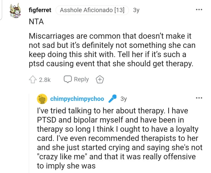 "Tell her if it’s such a ptsd causing event that she should get therapy"