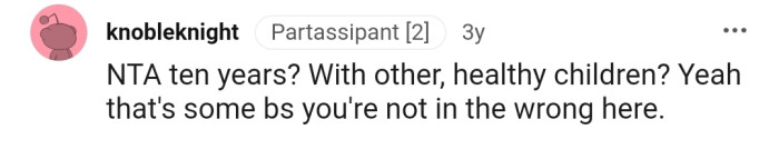 "NTA...Ten years? With other healthy children? Yeah that's some bs"