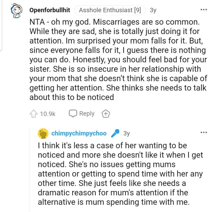 Reddit.comOP accused their sister of always bringing up her miscarriage for attention. Now the entire family is on OP's neck for making such a statement