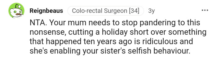 "NTA. Your mum needs to stop pandering to this nonsense"
