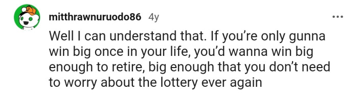 "If you’re only gonna win big once in your life, you’d want to win big enough to retire."