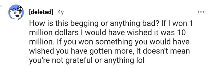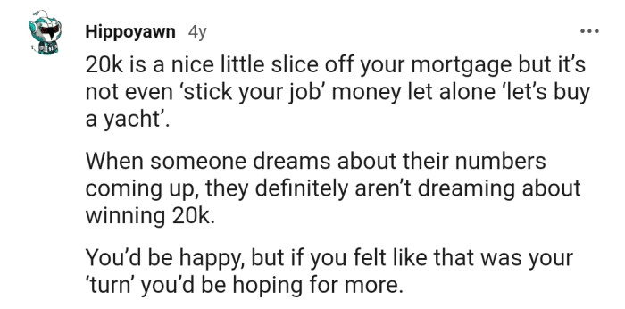 The Reddit community is torn on this matter. While many people agree that $20,000 is a lot to be grateful for, they admit that it's normal to wish your luck were a bit better.