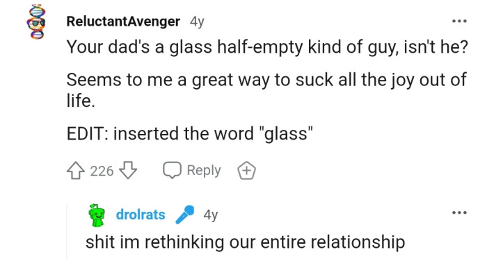"Your dad's a glass half-empty kind of guy, isn't he?"