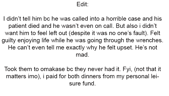 She didn't tell him about the change in dinner plans initially to avoid making him feel left out during an already tough day. The sushi dinner was also a special experience for their friends, who had never tried omakase before.