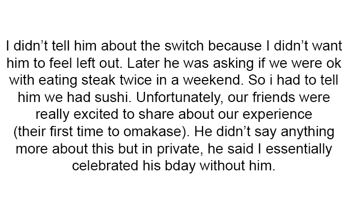 AITA For Upgrading Dinner Plans Without My Husband On His Birthday