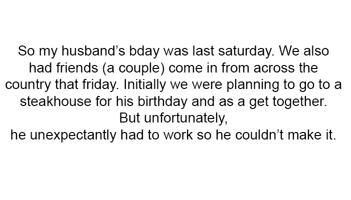 A woman recently turned to Reddit to seek opinions on a delicate situation involving her husband's birthday celebration. The couple had planned to go to a steakhouse with friends visiting from across the country, but her husband unexpectedly had to work on his birthday.