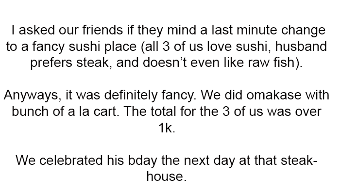 Faced with a last-minute change, she decided to take their friends to a fancy sushi restaurant instead, knowing her husband doesn't like raw fish and prefers steak. The next day, they celebrated his birthday at the steakhouse as initially planned.