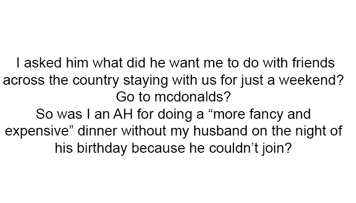However, her husband later expressed feeling left out, as he believed they celebrated his birthday without him. She now questions whether she was wrong for upgrading the dinner plans without him.