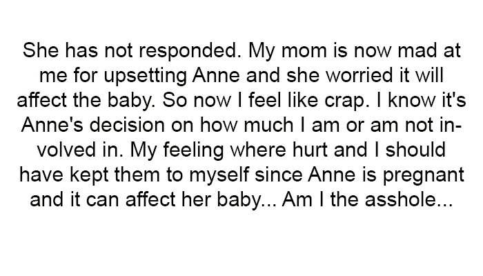 But things took a turn when Anne unexpectedly announced a different baby shower location and revealed that her husband's family was taking over the planning. Feeling hurt and sidelined, the woman expressed her feelings to Anne, leading to a tense exchange that left her questioning whether she had been unreasonable.