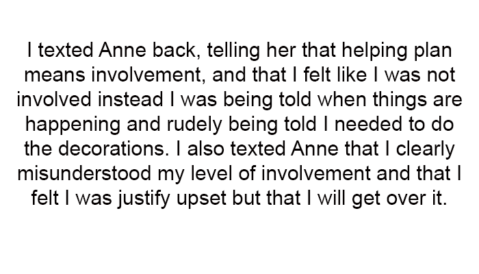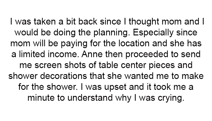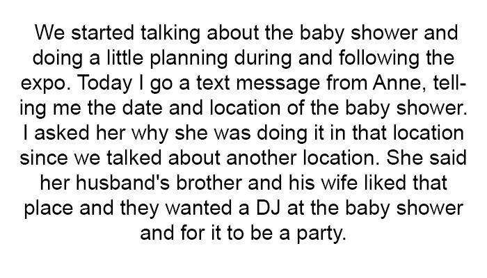However, she was shocked when Anne informed her of a different baby shower location decided by her husband's family, despite previous discussions about a different venue. To add to her frustration, Anne sent her instructions for making decorations for the shower without any prior discussion.