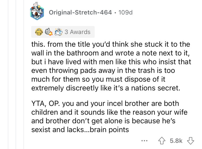 Reddit: r/AmItheA**holeOP's brother discovered the wife's used pad in his bathroom, and it "made him uncomfortable."