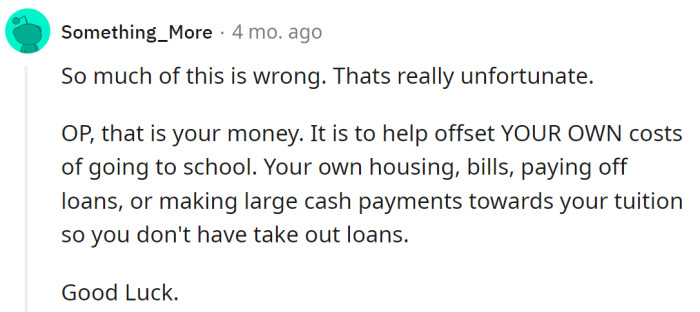 Although this was a challenging situation, Redditors considered all the facts and the involved parties and agreed that the family has some misunderstandings that need to be addressed. While it is the OP's money, and she has the right to spend it as she wishes, her stepfather made it possible for her, so the situation cannot be viewed in black and white.