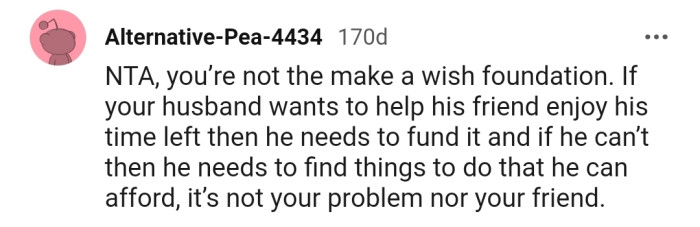 Reddit.comOP's fiancé has a best friend who is suffering from cancer and is planning to take him on a vacation. However, he wants OP to fund the trip, which they refuse.