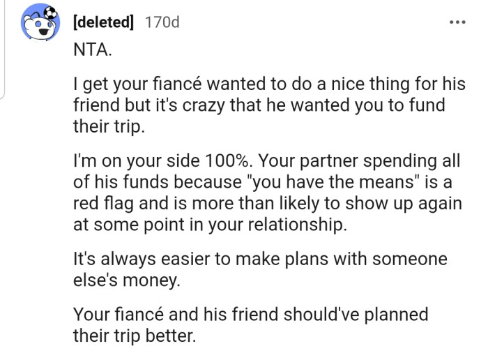 "I get your fiancé wanted to do a nice thing for his friend, but it's crazy that he wanted you to fund their trip."