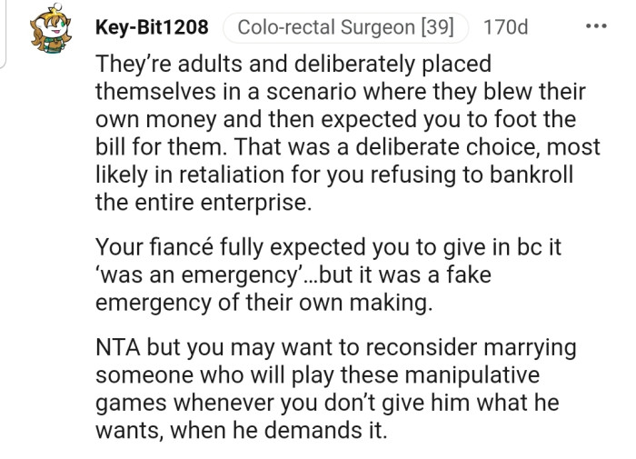 "Your fiancé fully expected you to give in because it ‘was an emergency’… but it was a fake emergency of their own making."