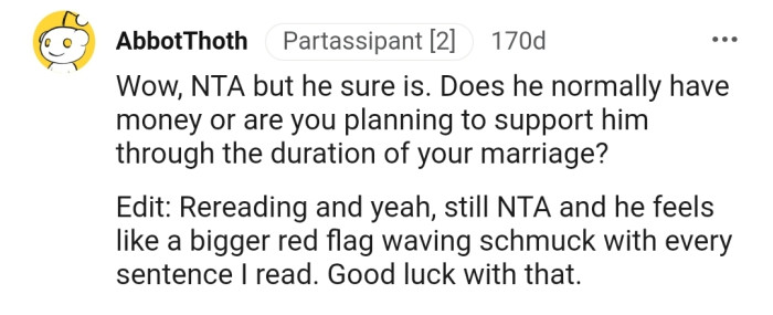 "Does he normally have money, or are you planning to support him throughout your marriage?"