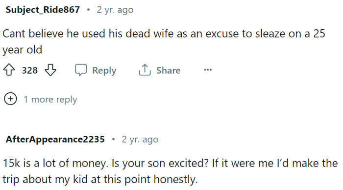 "Can't believe he used his dead wife as an excuse to sleaze on a 25-year-old" - what a person...