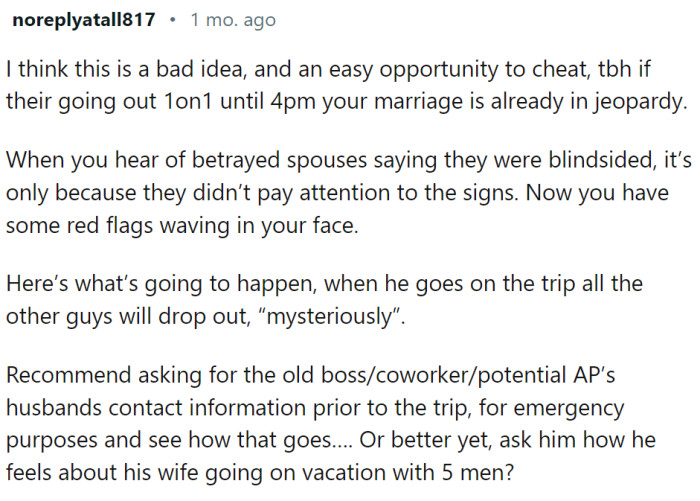 The husband recently received an invitation to go on vacation with this woman and a few other men, which has stirred up some mixed feelings. The woman recalls a time when her husband came home at 4 a.m. after hanging out with this friend.