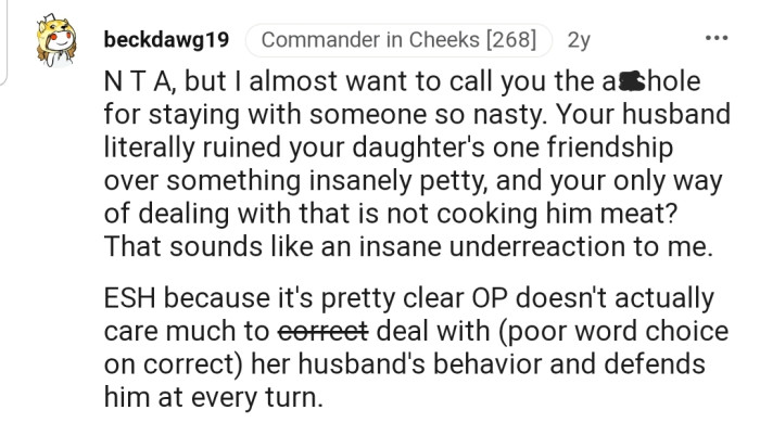 "Your husband literally ruined your daughter's one friendship over something insanely petty, and your only way of dealing with that is not cooking him meat?"