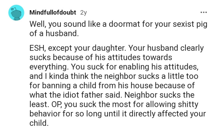 "Your husband clearly sucks because of his attitude...You suck for enabling his attitude"