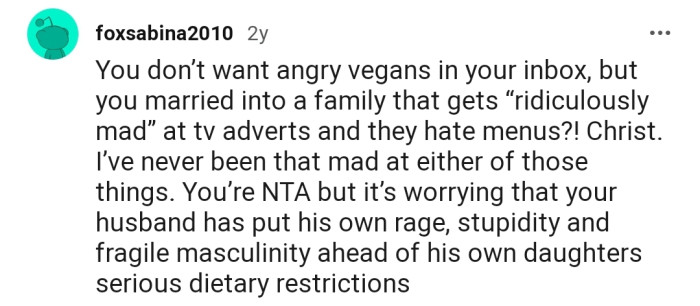 "It’s worrying that your husband has put his own rage, stupidity and fragile masculinity ahead of his own daughters serious dietary restrictions"
