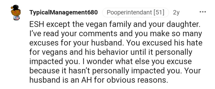 "You excused his hate for vegans and his behavior until it personally impacted you."