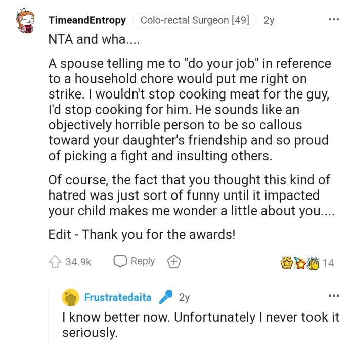 The commenters slammed their husband for needlessly destroying his daughter's friendship over a trivial matter, while OP faced reprimand for enabling such prejudiced behavior by merely imposing a minor punishment of meatless meals.