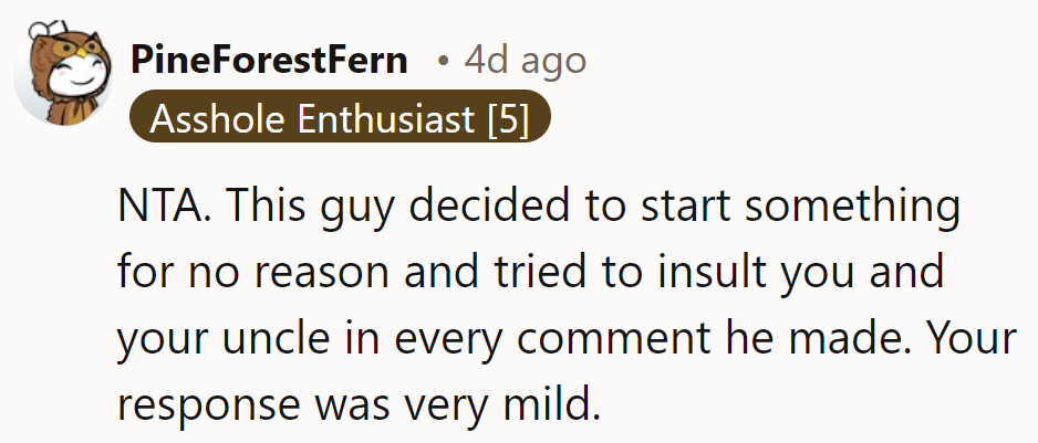 Annoyed, they said that their uncle was a veteran.