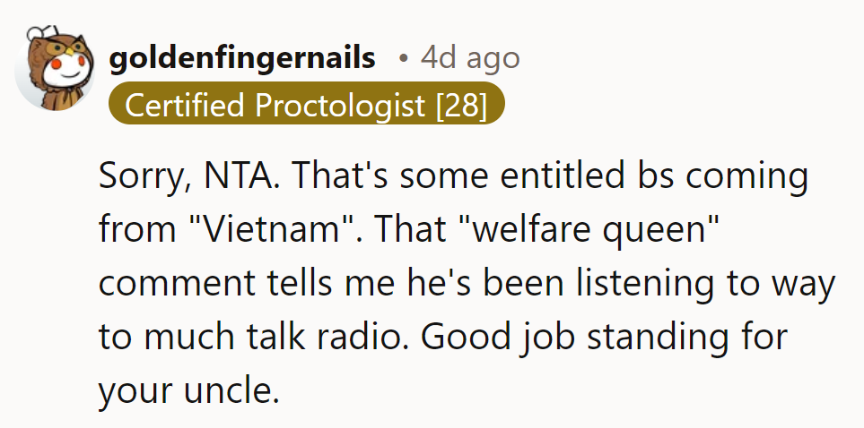 "Vietnam" and his entitled rant, plus the "welfare queen" jab? Talk radio much? Props for backing up their uncle.