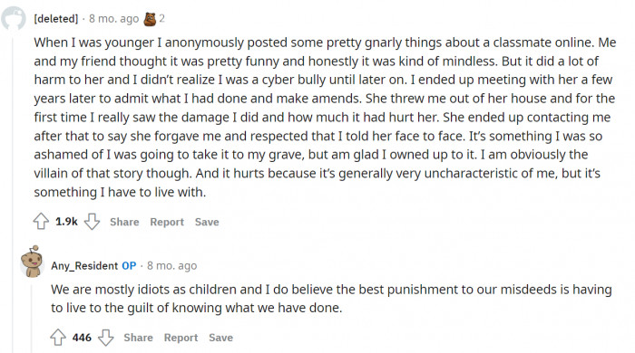 "We are mostly idiots as children, and I do believe the best punishment for our misdeeds is having to live with the guilt of knowing what we have done." OP got it right!