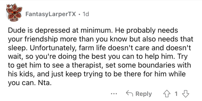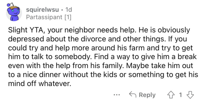 Reddit/Ok-Appointment-6518The Redditor explained that his neighbor has a farm, three children, and is recently divorced.