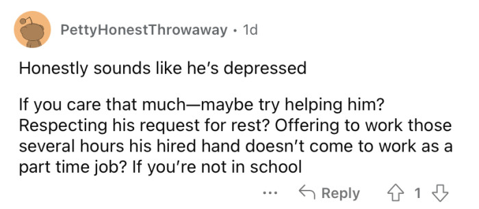 The OP says his neighbor's hired hand doesn't show up until around 11 am each day. The Redditor says his neighbor uses that as an excuse for why he can't get anything done, but the OP thinks his friend is becoming lazy.