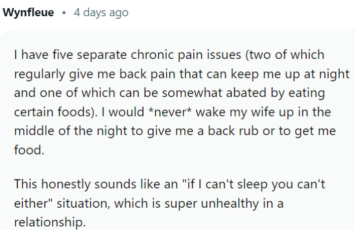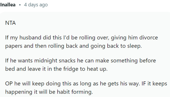 Not wanting to be disturbed during deep sleep, OP expressed her dissatisfaction, stating that her husband should refrain from making this a habit. She believes he should get his own midnight snack or ask for a rub before going to bed.