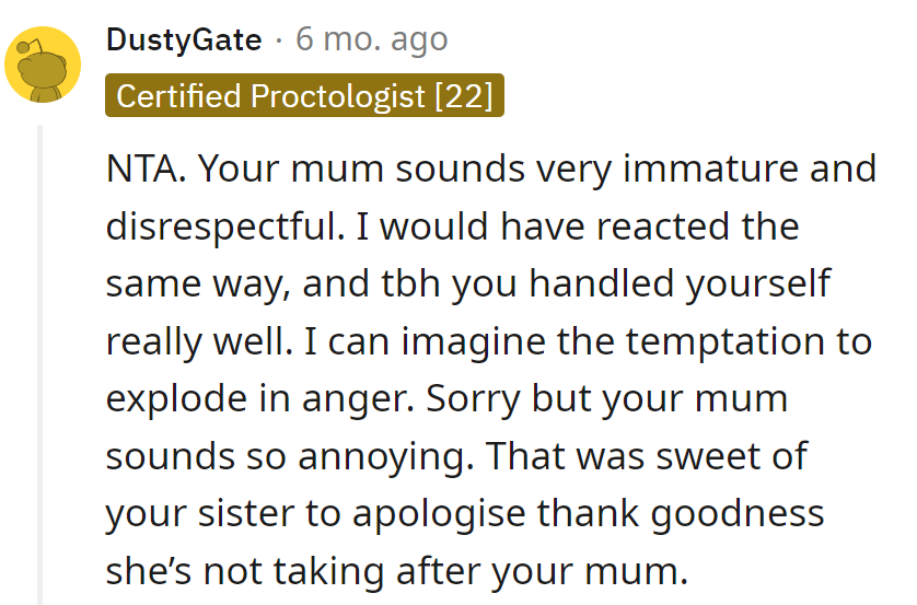 Mom's a masterpiece in the "piece of work" collection. Keeping it cool with the little sis as the audience—therapy's the real MVP!