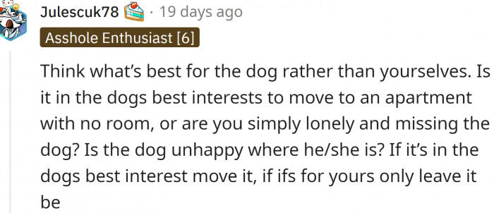RedditNow that OP has an apartment in a dog-friendly building and a couple of dog parks nearby, she wants the dog back. This is especially true now that she works from home while her husband is in the office.