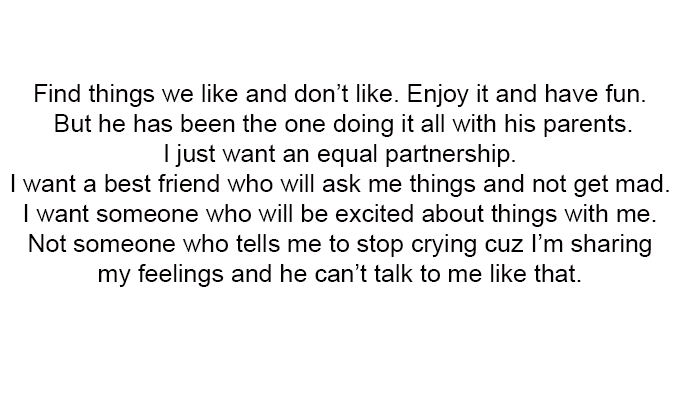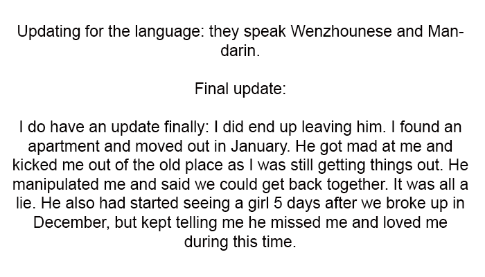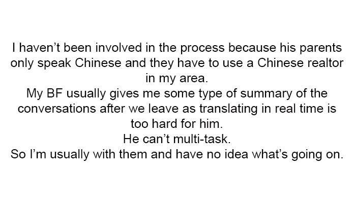 The boyfriend, with significant financial help from his parents, is focused on purchasing a house intended for their future together. However, the woman feels excluded from the process, partly because his parents only speak Chinese, necessitating the use of a Chinese realtor.